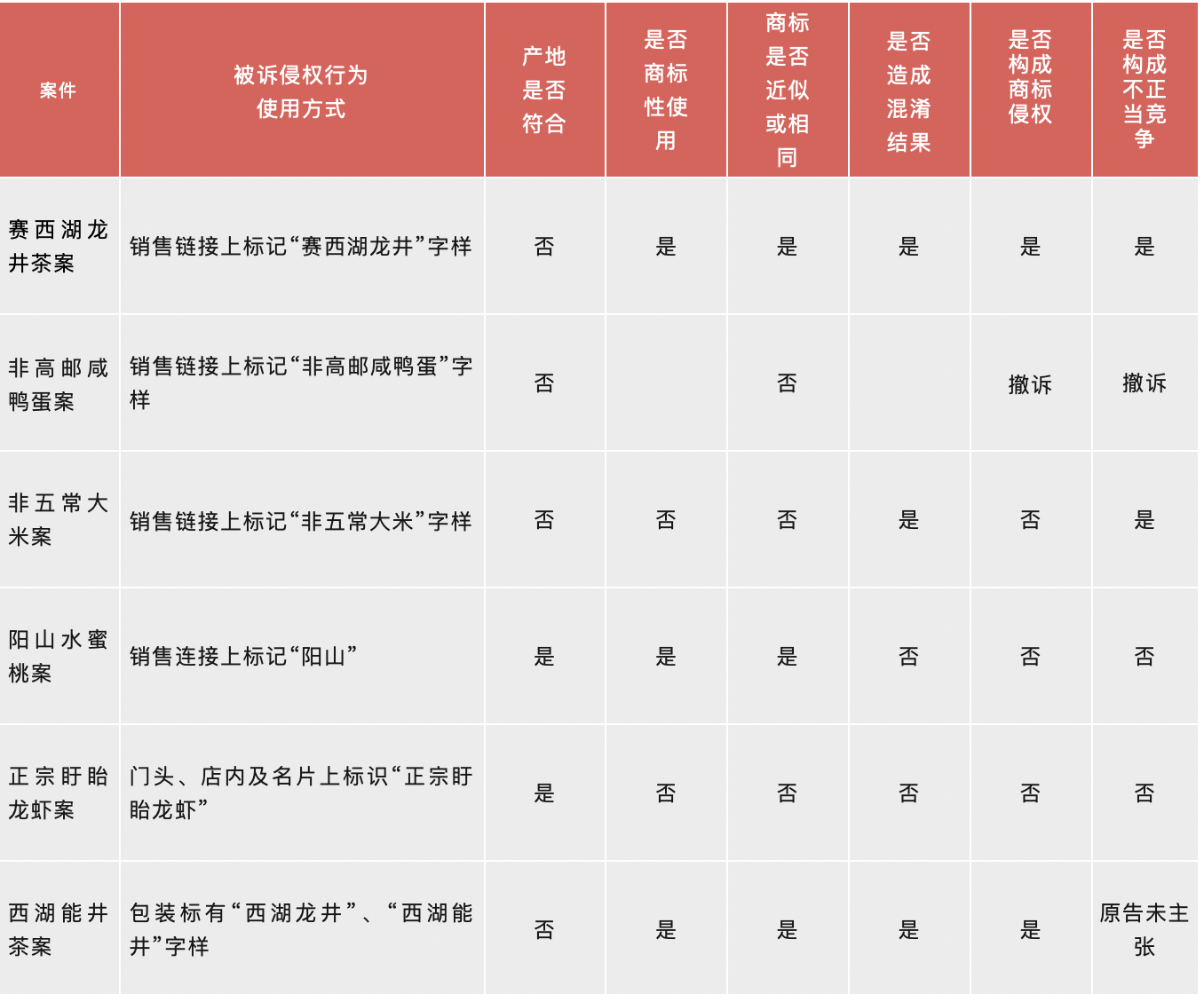在地理标志证明商标侵权类案件中,笔者整理了包括前述龙井茶、高邮鸭蛋以及五常大米等典型案例,梳理了法院认定正当使用的构成要件、审查要点以及认定结果。